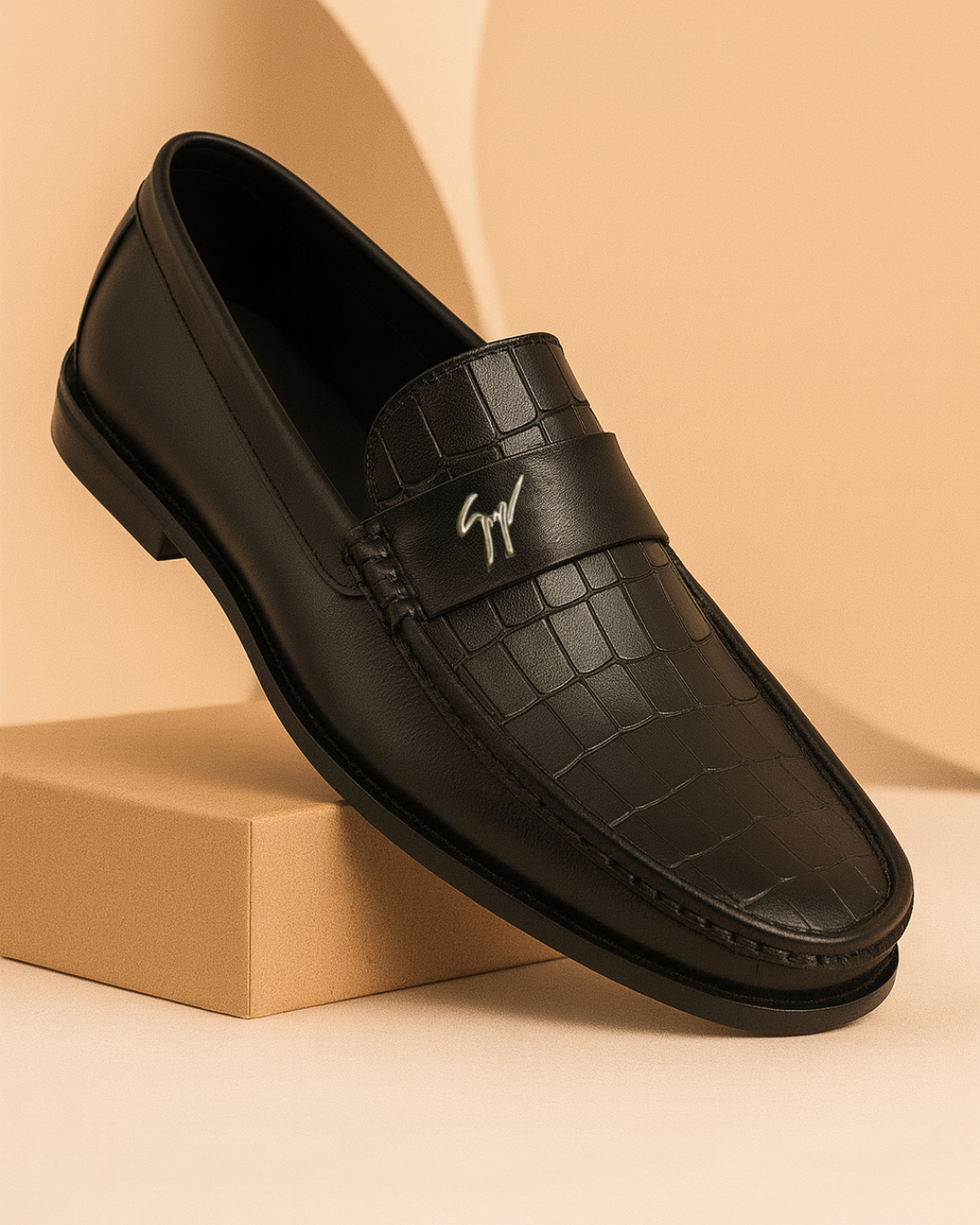 Where elegance meets edge — the Old Money loafer features a rich black croc-textured upper, detailed stitching, and a signature metallic emblem. Designed for modern sophistication and all-day comfort.